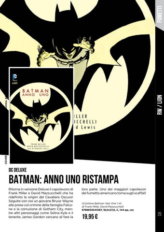 BATMAN: ANNO UNO RISTAMPA Ritorna in versione Deluxe il capolavoro di Frank Miller e David Mazzucchelli che ha ridefinito le origini del Cavaliere Oscuro! Seguite con noi un giovane Bruce Wayne alle prese col crimine della famiglia Falcone e la corruzione di Gotham City, mentre altri personaggi come Selina Kyle e il tenente James Gordon cercano di fare la