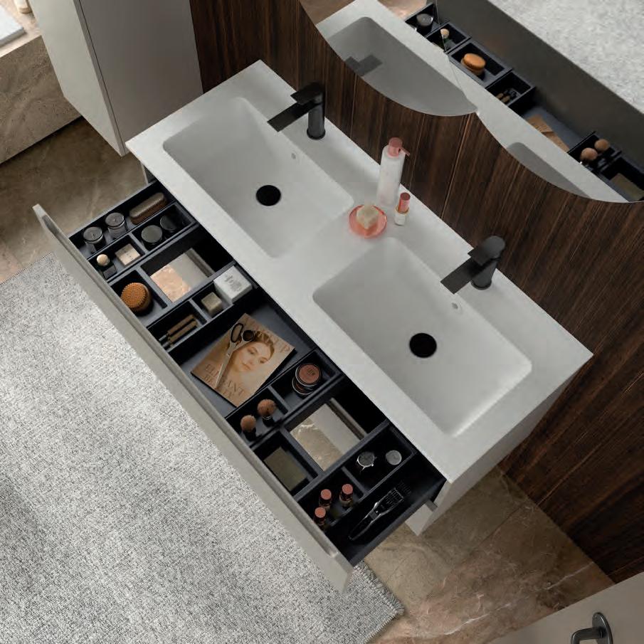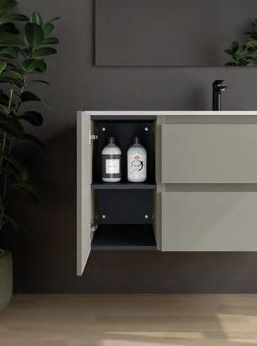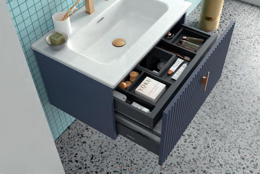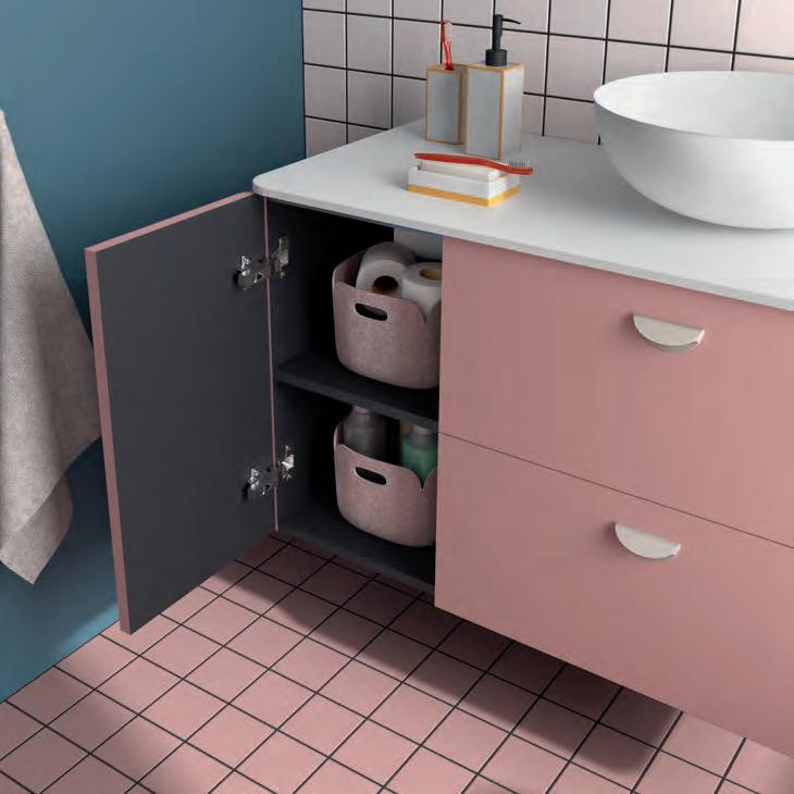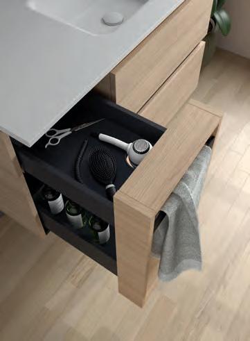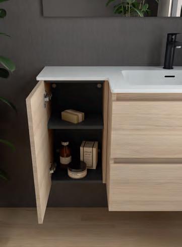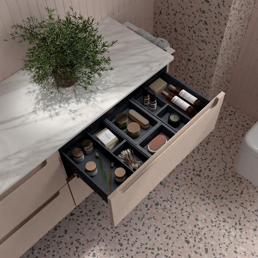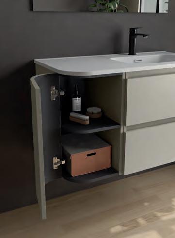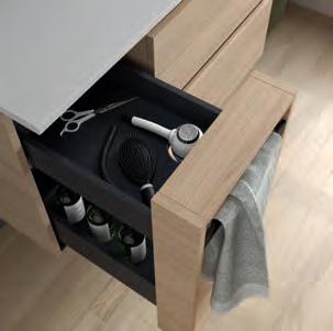 Een opberglade gecombineerd met een volledig interne lade, zonder sifonuitsparing, biedt een uitzonderlijke opbergcapaciteit binnen een compact ontwerp. De beweging is soepel en licht dankzij de Grass V8lades, waardoor gebruikers bij elke opening de kwaliteit kunnen ervaren.
