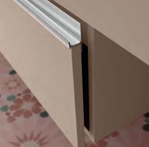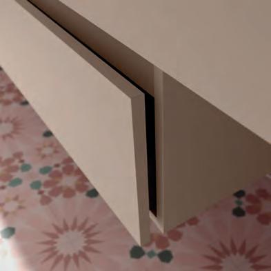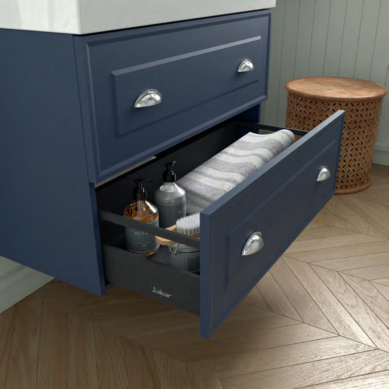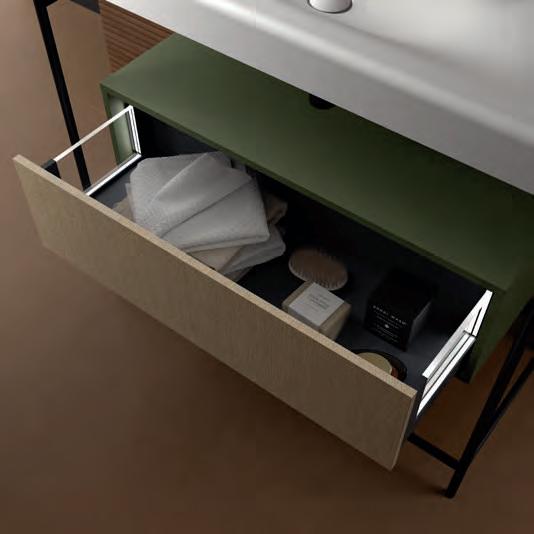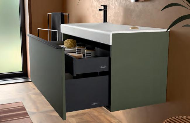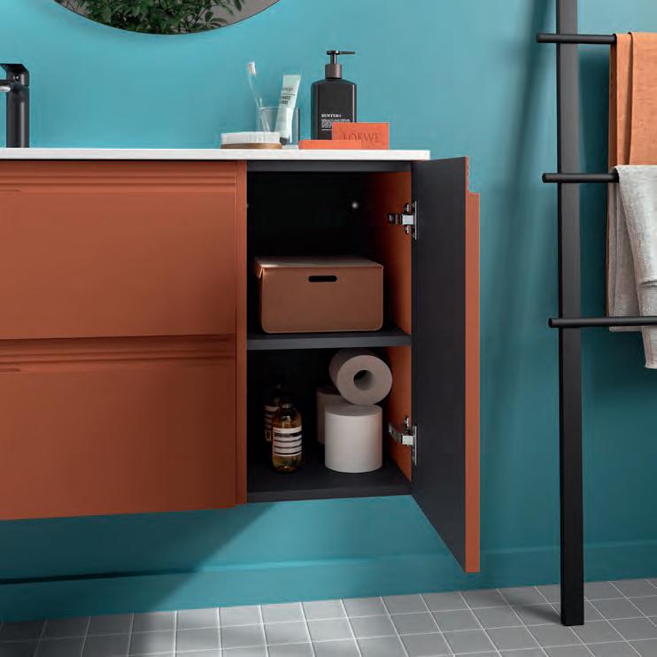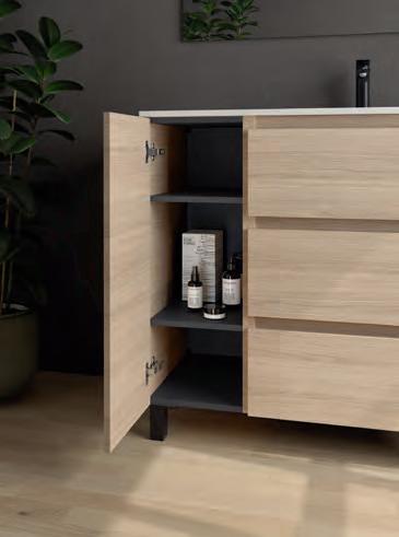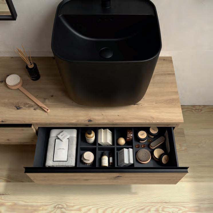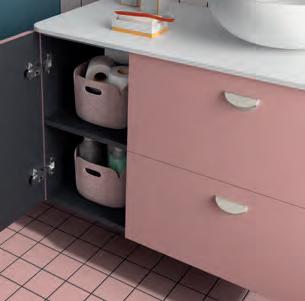 Een opberglade gecombineerd met een volledig interne lade, zonder sifonuitsparing, biedt een uitzonderlijke opbergcapaciteit binnen een compact ontwerp. De beweging is soepel en licht dankzij de Grass V8lades, waardoor gebruikers bij elke opening de kwaliteit kunnen ervaren.