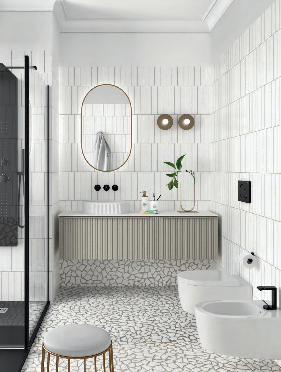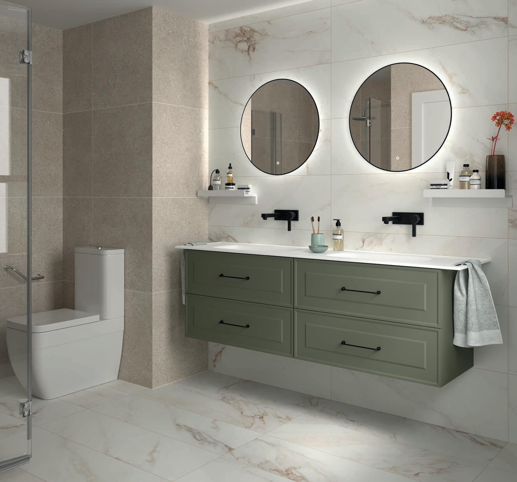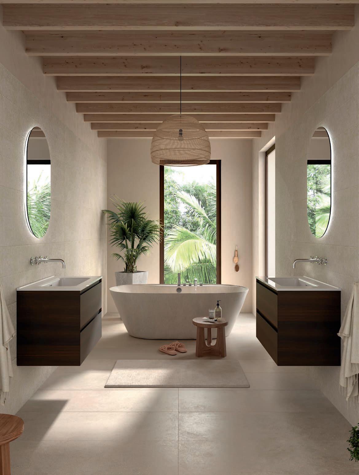 Samen creëren ze een serene en eigentijdse badkamer waar materiaal en vorm zich in perfecte balans en elegantie verhouden