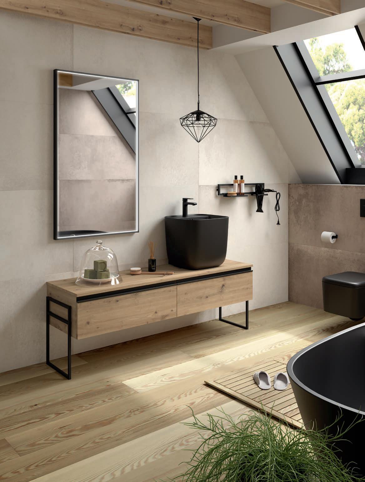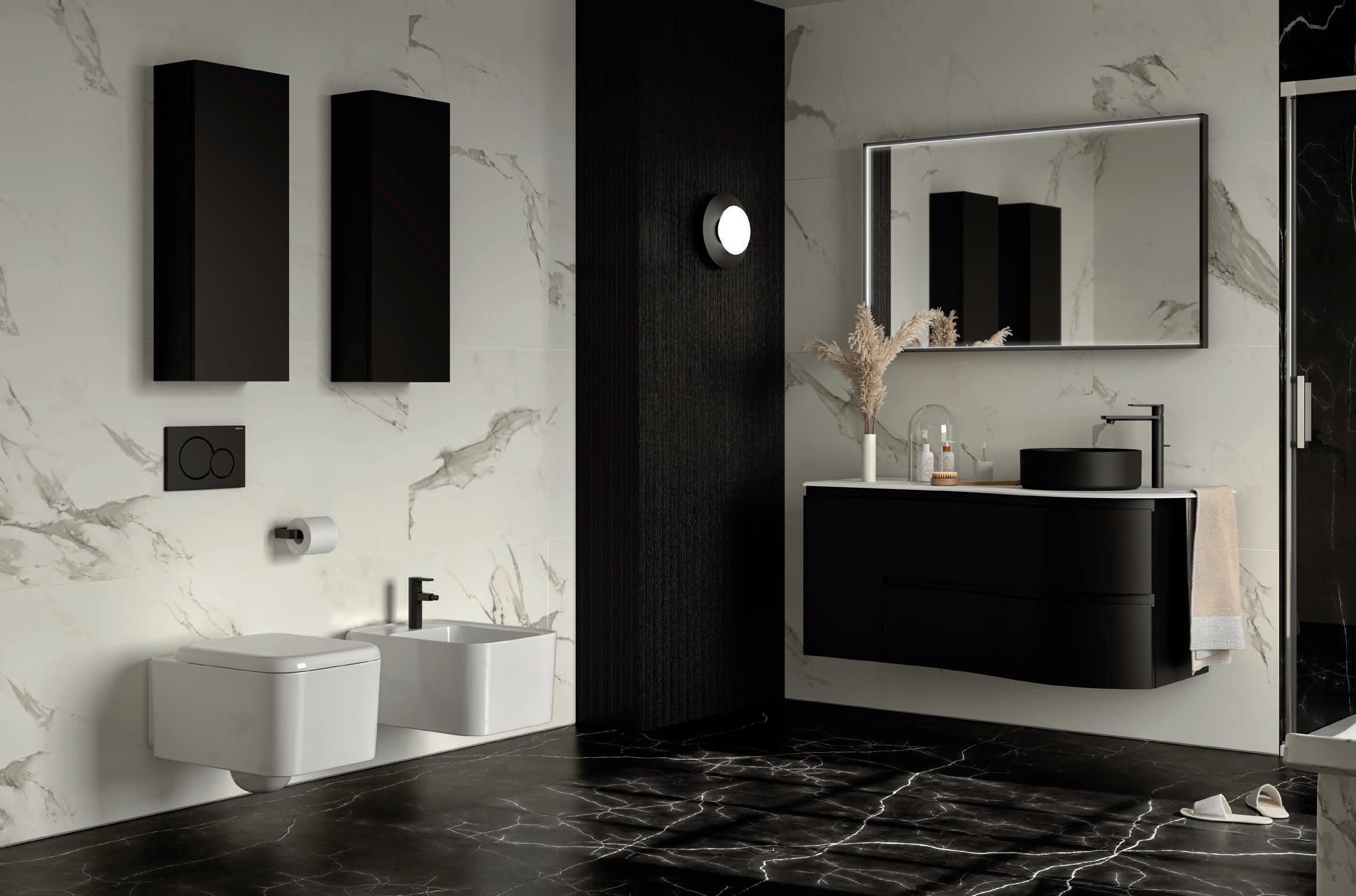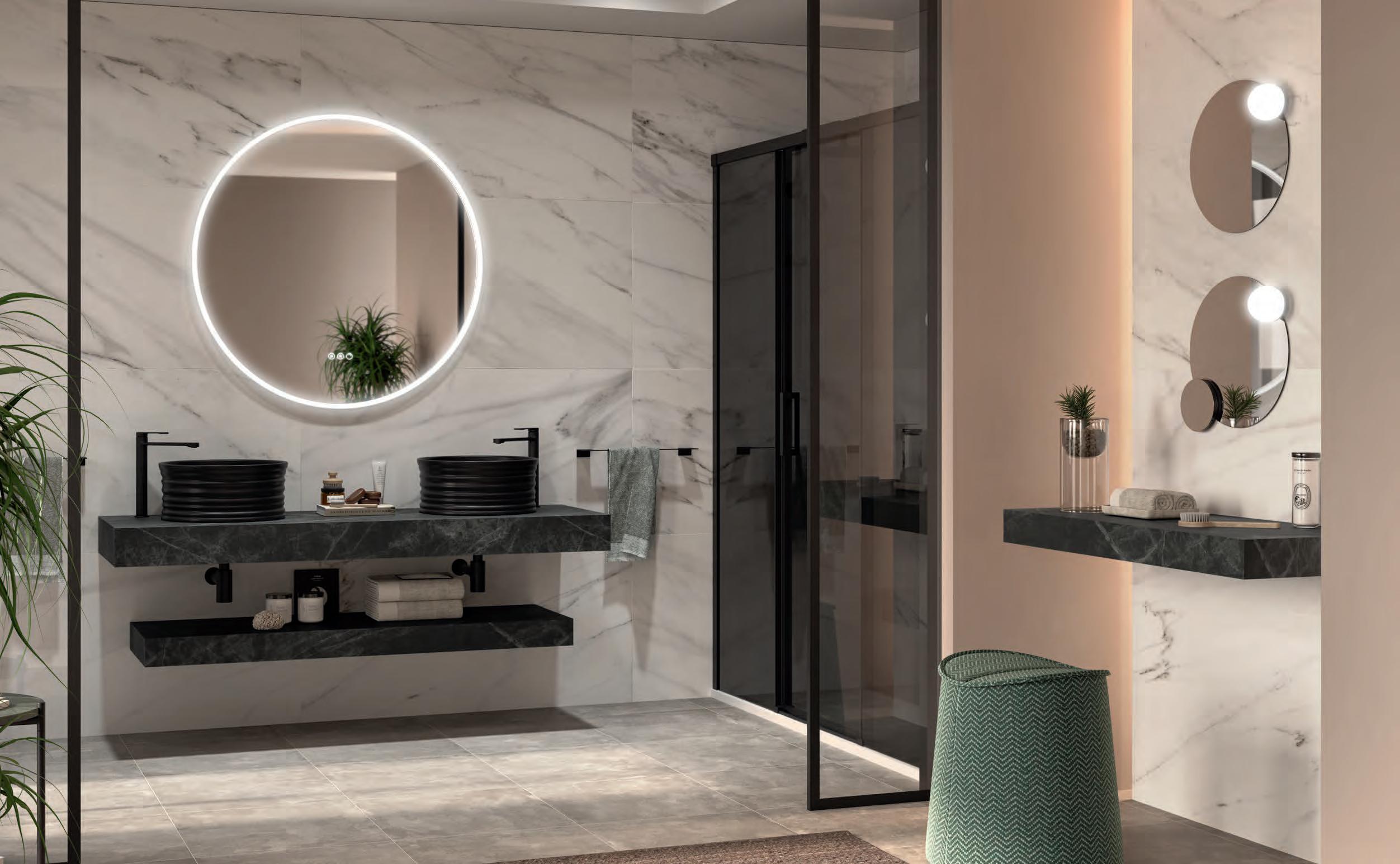 Samen creëren ze een serene en eigentijdse badkamer waar materiaal en vorm zich in perfecte balans en elegantie verhouden