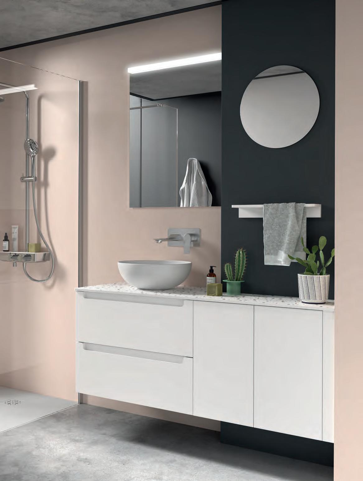De combinatie van de Mara-serie met de Constanza wastafel, gemaakt van mat geglazuurd keramiek, voegt een vleugje zachtheid en verfijning toe aan het geheel: een fluweelachtige textuur die puurheid en rust uitstraalt