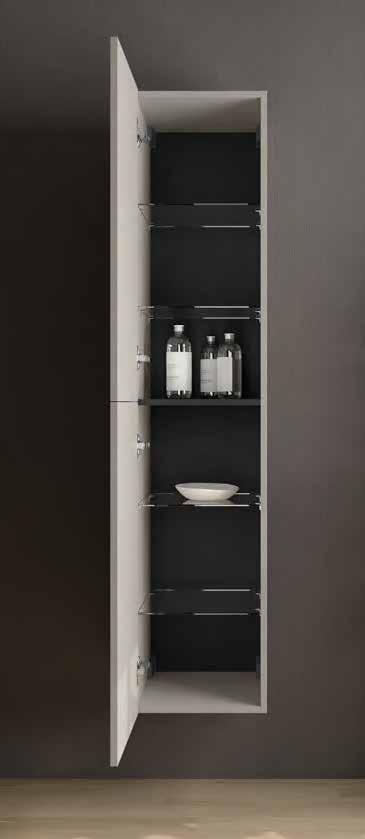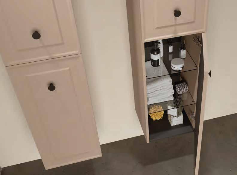 Complete your bathroom with tall unit Renoir , designed with fronts that match the furniture and in the same nishes. It is tted with four height-adjustable glass shelves, adding space and style to your bathroom.