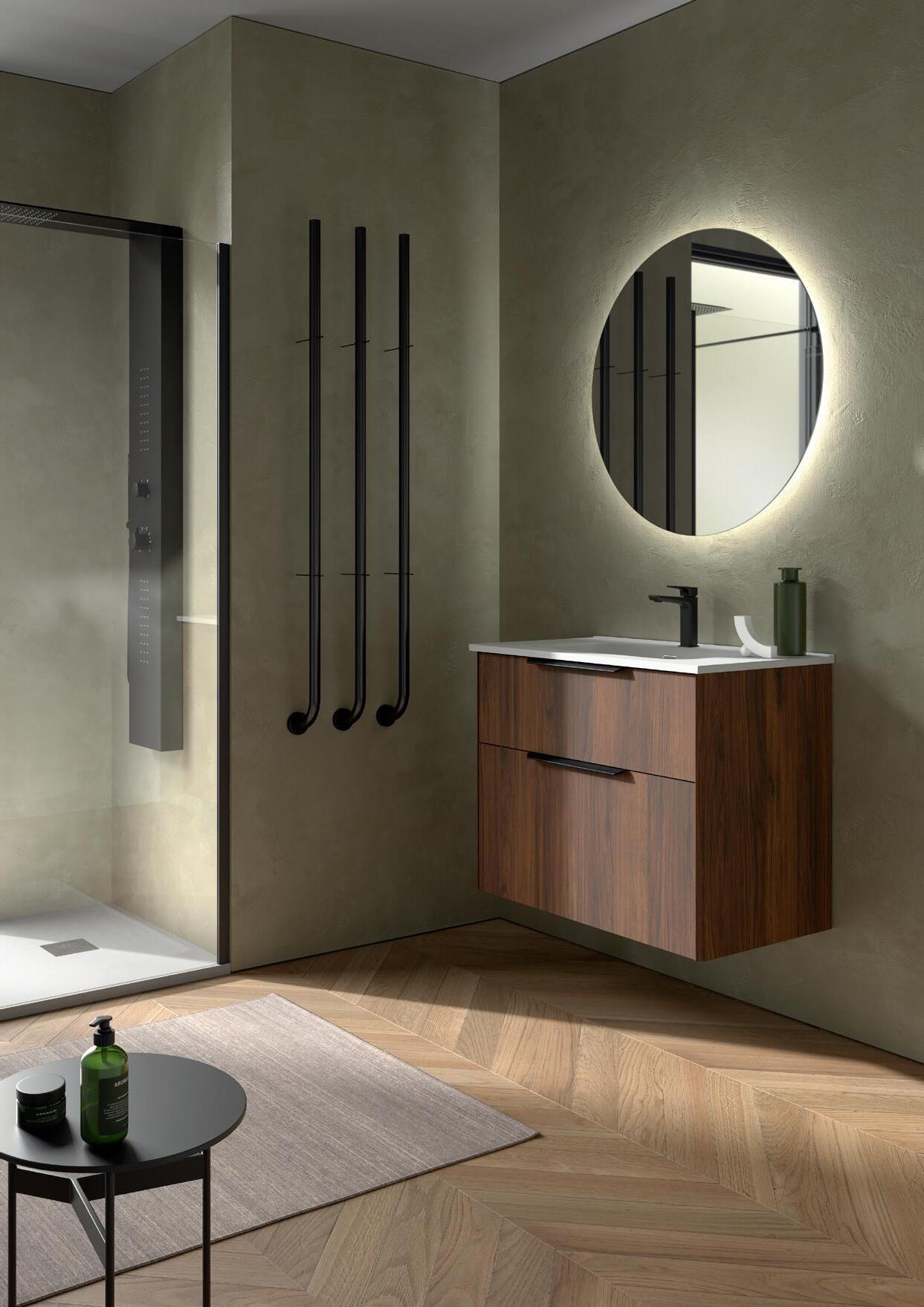 Composition Silane 1000 Cod. 118036 - Ensemble Complet SILANE 1000 Noyer Maya - 560€ | 3x Cod. 113509 - Poignée QUILT Matt black - 25€/un. | Cod. 97177 - Applique PANDORA 308 Matt black - 62€ | Cod. 113642 - Colonne SILANE Noyer Maya - 264€