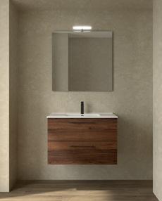 Composition avec meuble NOJA, plan vasque IBON en céramique, miroir et, applique LED. Pour les compositions en 1400, le plan vasque est en charge minérale