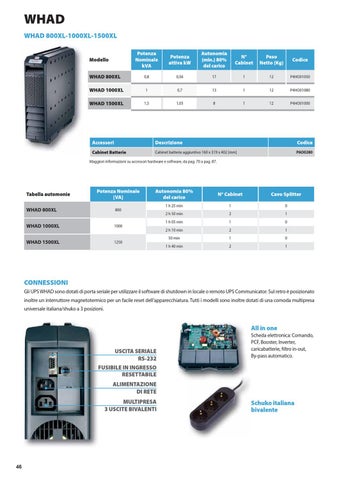 CONNESSIONI Gli UPS WHAD sono dotati di porta seriale per utilizzare il software di shutdown in locale o remoto UPS Communicator. Sul retro è posizionato inoltre un interruttore magnetotermico per un facile reset dell’apparecchiatura. Tutti i modelli sono inoltre dotati di una comoda multipresa universale italiana/shuko a 3 posizioni.