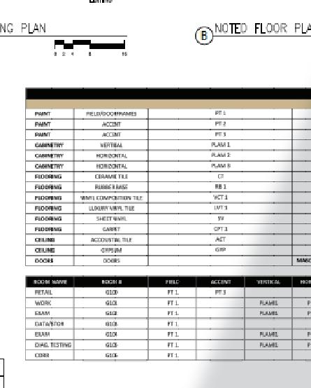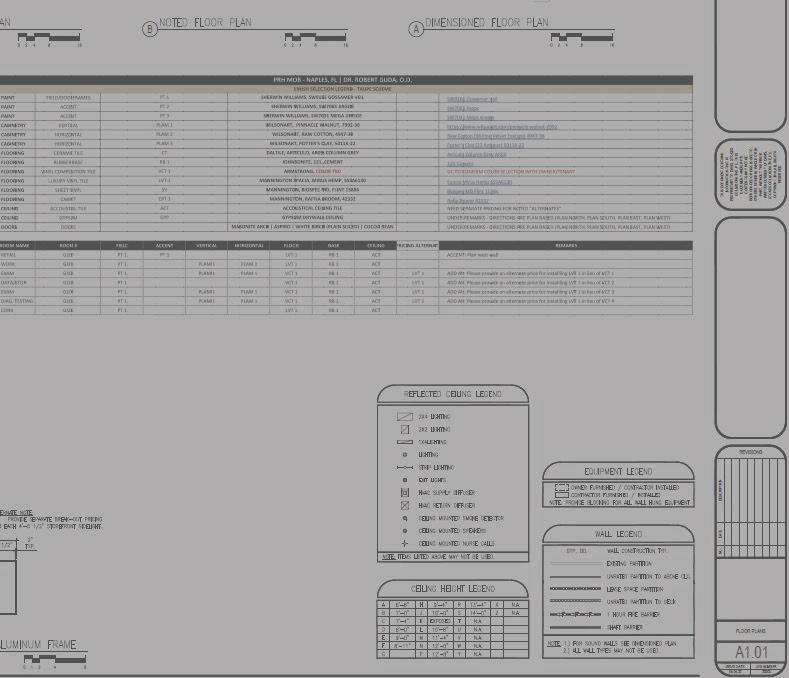 CD is the complete set of drawings used to construct the practice space and can be up to 20+ pages. Below is an example page from the CD which explains the details related to the chosen finishes, ceiling grid, dimensions of the suite, and doors.
