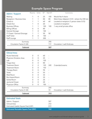 Waiting 1 4 25 100 Would like 4 chairs Reception / Business Area 1 1 80 80 Work Area; Adjacent CI/O - where the OM sits Check-In 1 1 60 60 Located at reception (1 person does CI/O) Check-Out 1 0 60 - Located at reception Business Offices 1 1 100 100 1 very small private office Billing Offices 0 0 80General Storage 1 0 100IT Closet / General Strorage 1 1 50 50 Staff Toilet 0 0 100Staff Lounge 1 1 200Summary 390 Circulation Factor (1.30) 117 Circulation / wall thickness Subtotal 507 Rooms Units SF Net SF Comments Admin / Support Nurse Station(s) 0 0 60Physician Dictation Area 0 0 45Lab 0 0 120Triage Area 0 0 80Treatment Room 2 2 120 240 2 standard exams Treatment Room 0 0 150Therapy Room 0 0 90Toilet 0 0 55Med Room 0 0 35Bio-Hazard Room 0 0 35Soiled Room 0 0 35Janitorial Closet 0 0 20Physician Office 0 0 100Clinical Area Summary 240 Circulation Factor (1.30) 72 Circulation / wall thickness Subtotal 312 Estimated Totals Admin / Support 507 Clinical Area 312 Estimated Usable Square Feet (USF) 819 Estimated Rentable Square Feet (RSF) 942