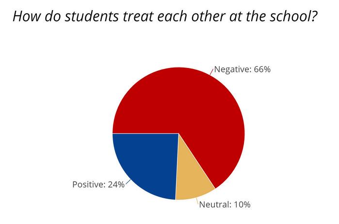 To provide a deeper understanding of kindness, we administered an open-ended item asking how students treat each other at school, and to gain a global understanding, I employed a sentiment analysis tool, categorizing each comment as negative, positive, or neutral. Figure 4 displays sentiment analysis of students across schools, indicating that two-thirds of the responses were negative.