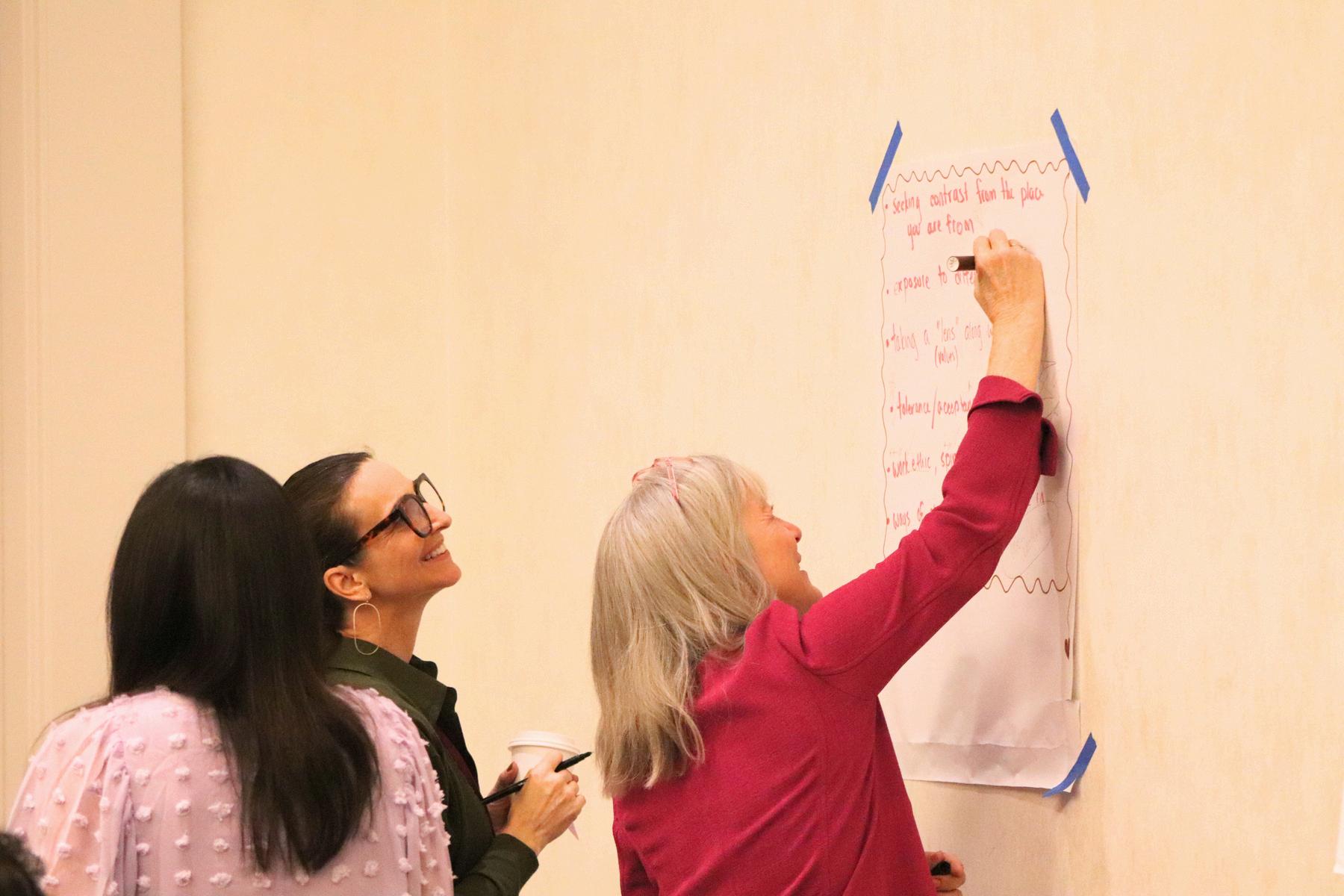 Next, I broke the participants into small groups of two. Participants should be with people they don’t know well. They spent the first part of this time listening to each other’s reflections. After each person has been heard, the group begins to identify common themes or core differences in their experiences. These creative notes are fused into rhyming couples and delivered to me at the close of this section.