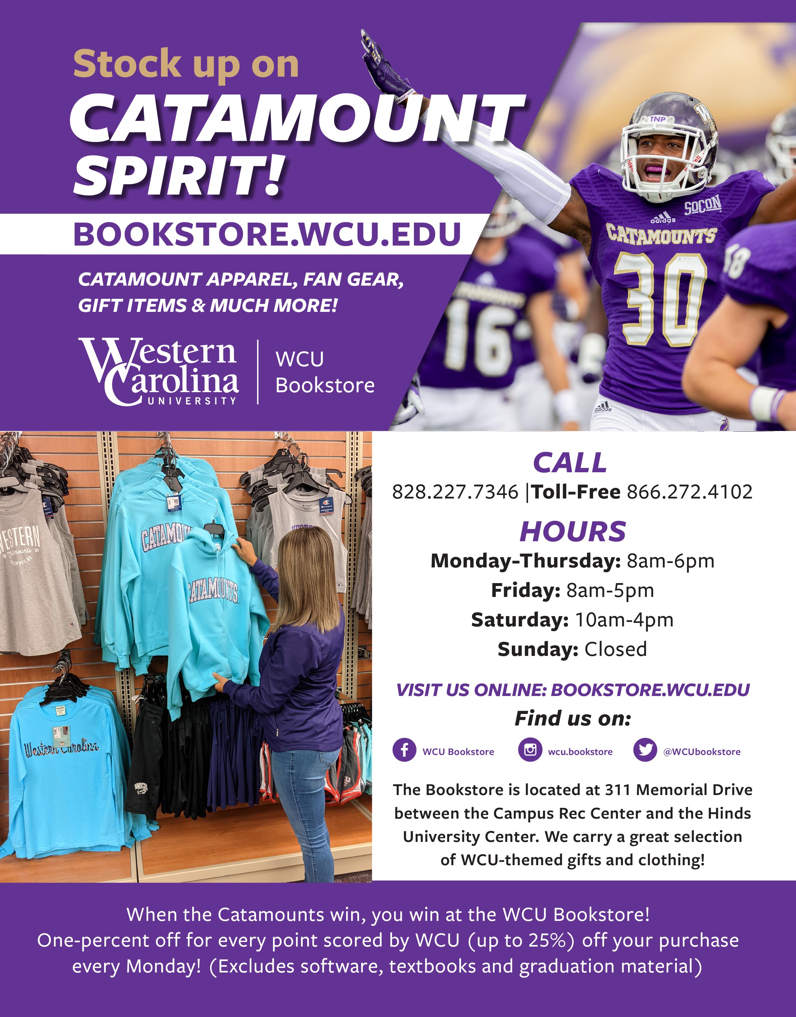Catamount apparel and game day merchandise from the WCU Bookstore can be found at stands on both sides of the stadium and online at www.bookstore.wcu.edu. Merchandise is also available anytime at CatamountSports.com through CatamountFanShop, or also at the WCU Bookstore located near the center of the WCU campus.