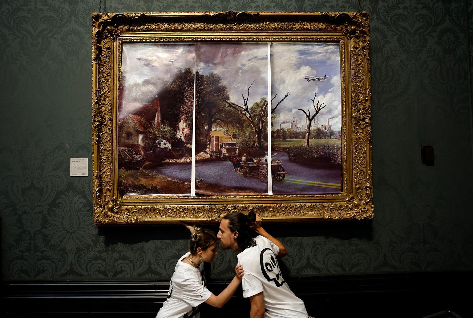 Protestantes: Just Stop Oil Jóvenes pegan posters sobre la obra para presentar una versión en la que se muestra el mismo paisaje, pero contaminado, al mismo tiempo que pegan sus manos al marco