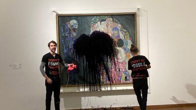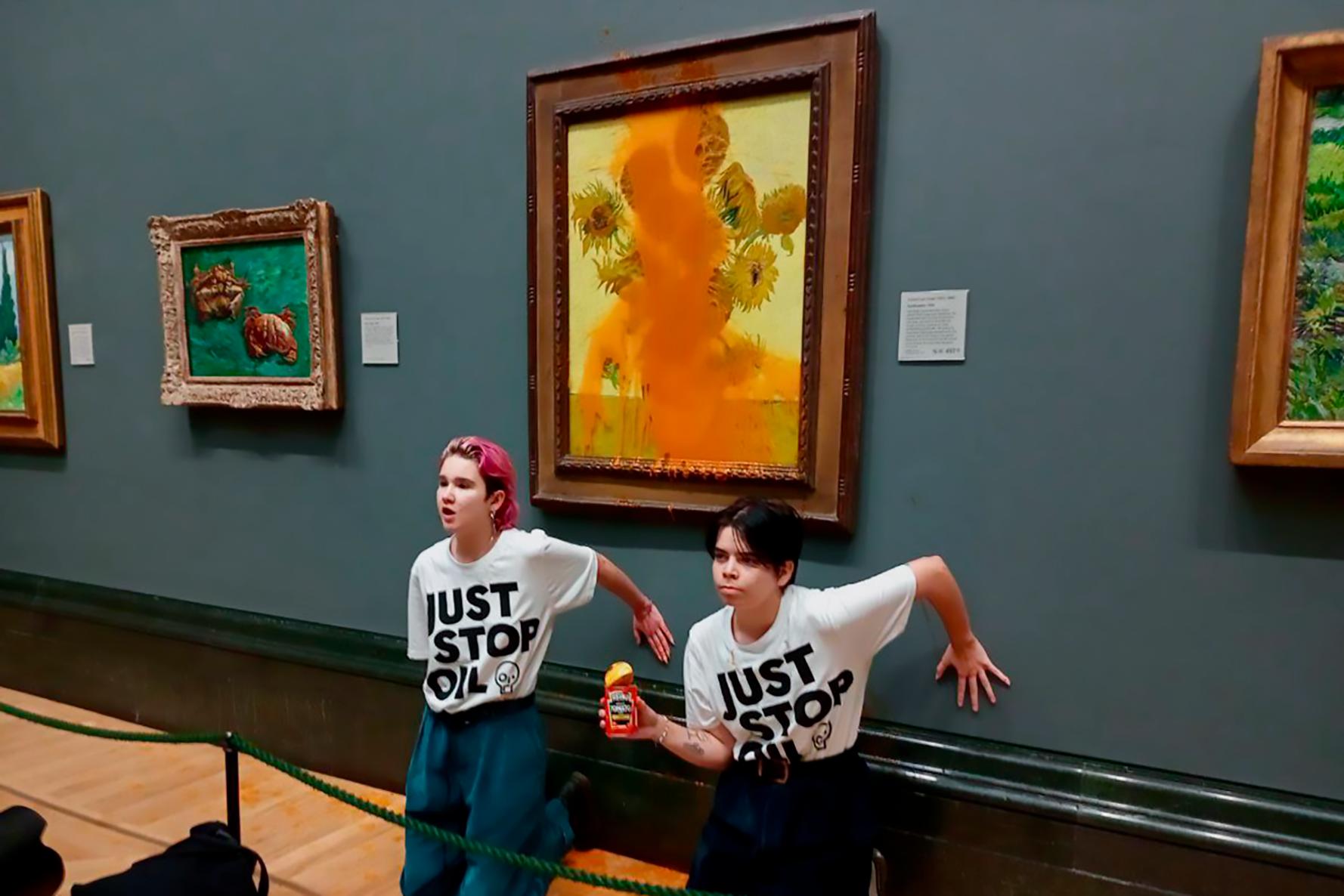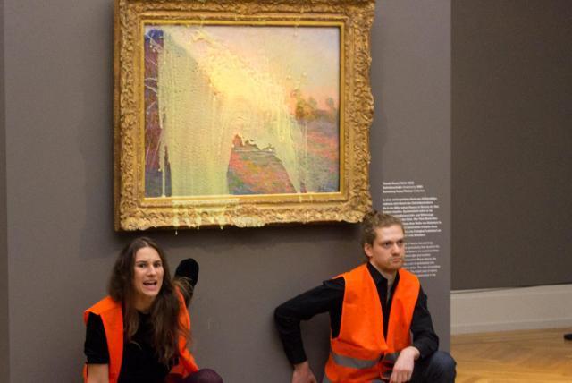 Dos personas pegaron sus manos al cristal de la obra y desplegaron una pancarta que decía: "Caos climático = guerra + hambruna."