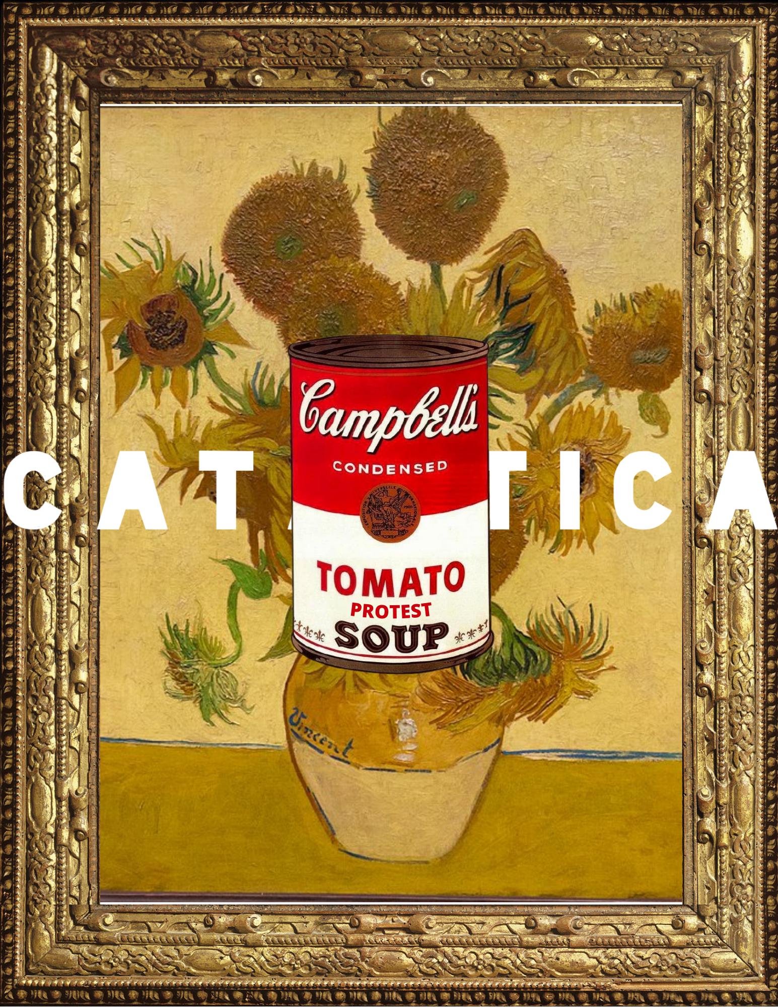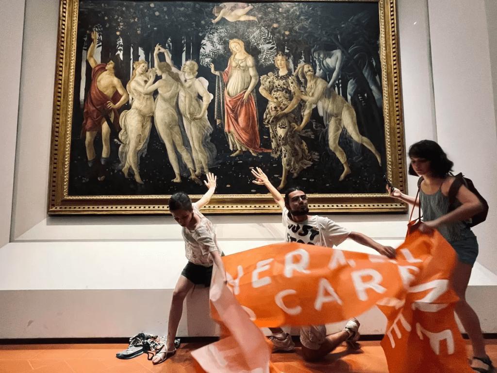 Protestantes: Ultima Generazione Trio arroja sopa de verduras a la obra y pegan sus manos a la pared del recinto.