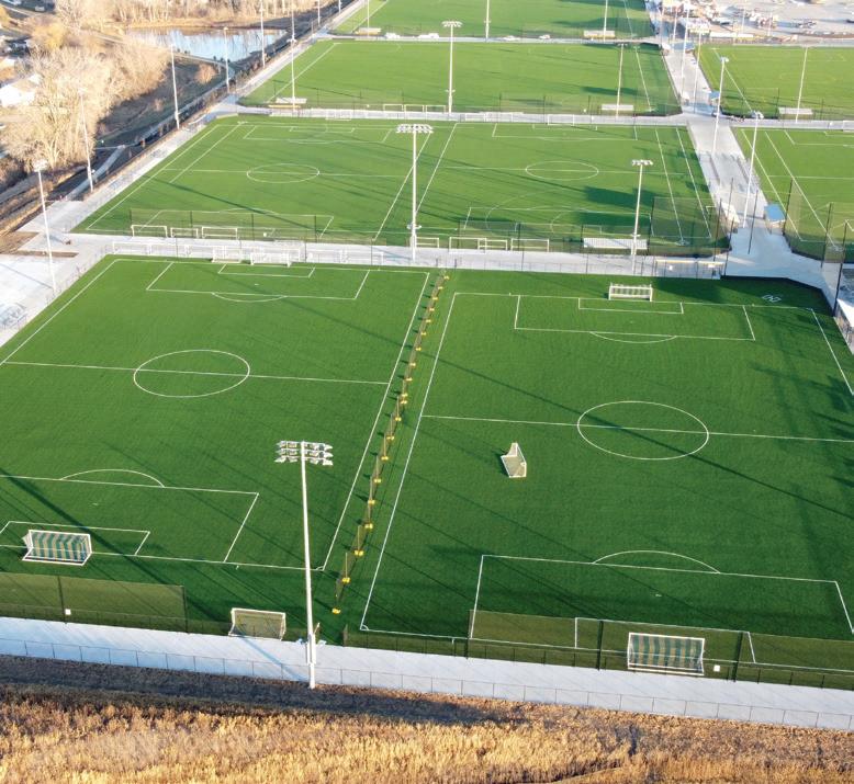 Full-size soccer field measuring 355’x 245’ featuring scoreboards, a sound system, and divider curtains to segment the field into three separate areas