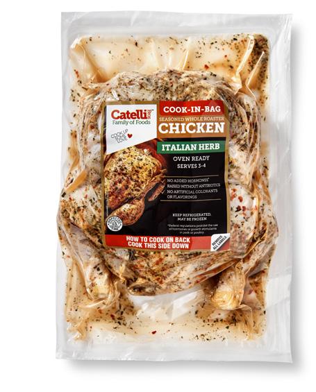 SEASONED WHOLE ROASTER CHICKEN NO ADDED HORMONES RAISED WITHOUT ANTIBIOTICS NO ARTIFICIAL COLORANTS OR FLAVORINGS COOK-IN-BAG Serving ugg estion KEEP REFRIGERATED, MAY BE FROZEN *Federa regulations prohib t the use of hormones or growth stimulants n pork or poultry. ITALIAN HERB OVEN READY SERVES 3-4 HOW TO COOK ON BACK COOK THIS SIDE DOWN REMOVE ALLLABELS Packed By: Catelli Brothers Family of Foods, 71 Blackstone Street Sutton MA 01590 USE OR FREEZE BY: THIS PRODUCT WAS PREPARED FROM INSPECTED AND PASSED MEAT AND/OR POULTRY.SOMEFOOD PRODUCTSMAY CONTAIN BACTERIA THAT COULD CAUS ILLNESSIF THE PRODUC S MISHANDLEDORCOOKED IMPROPERLY. FORYOURPROTECTION,FOLLOWTHESE SAFEHANDLINGINSTRUCTIONS. SAFE HANDLING INSTRUCTIONS KEEP RAW MEAT AND/OR POULTRY PRODUCTAWAYFROMOTHERFOODS. WASH WORKINGSURFACES (INCLU NG CUTTINGBOARDS) UTENSILS ANDHANDS AFTER TOUCHING MEA R POULTRY. KEEP FROZEN. THA REFRIGERATORORMICROWAVE. COOK THOROUGHLY. KEEP HO FOOD HOT. REFRIGERATE LEFTOR DISCARD. % Daily Value* Total Fat 17g 22% Saturated Fat 0g 0% Trans Fat 0g Cholesterol 90mg 30% Sodium 610mg 27% Total Carbohydrate 2g 1% Dietary Fiber 0g 0% Total Sugars 0g Includes 0g Added Sugars 0% Protein 20g Vitamin D 0mcg 0% Calcium 10mg 0% Iron 1.6mg 8% Potassium 30mg 0% *The % Daily Value (DV) tells you how much nutrient in serving of food contributes to a daily diet. 2,000 calories day is used for general nutrition advice. Varied servings per container Serving size 4 oz (113g) Amount per serving Calories 240 Nutrition Facts Italian Herb & Parmesan Whole Roaster Chicken Ingredients: Whole Roaster Chicken, Garlic Herb Parmesan Rub (Sea Salt, Parmesan Cheese (Pasteurized Cow's Milk, Cheese Culture, Salt, Enzymes), Dehydrated Garlic, Spices including Basil, Oregano and Thyme, Red Bell Pepper, Demerara Sugar, Dehydrated Onion, Yeast Extract, Natural Chicken Flavor, Corn Starch). Contains: Milk. REMOVE ALL LABELS & COOK IN BAG THIS SIDE UP, 425°F 75 MINS. Do Not Microwave in Package. Cook to 165°F. BPA Free Packaging COOKING INSTRUCTIONS 1. Preheat oven to 425 F. 2. Place package on roasting pan on center oven rack. 3. Cook for 75 minutes or until internal temperature of 165 F. 4. Remove from oven, cut open bag, and place chicken and sauce on serving dish. 5. If you’ve frozen chicken, defrost in refrigerator before cooking. BACK LABEL PLACE WEIGHT LABEL HERE NON AQUEOUS AREA 3” VEAL | AMERICAN LAMB | IMPORTED LAMB | BEEF | CHICKEN | PORK | TURKEY