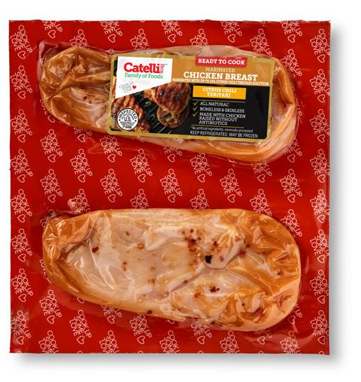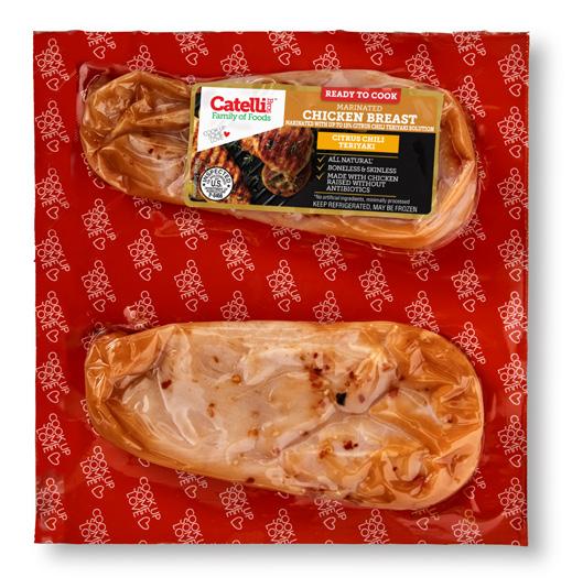 700-1495 Citrus Chili Teriyaki Chicken Breast Catelli Brothers Family of Foods 01590 USE OR FREEZE BY: THIS PRODUCT WAS PREPARED FROM INSPECTED AND PASSED MEAT AND/OR POULTRY. SOME FOOD PRODUCTS MAY CONTAIN BACTERIA THAT COULD CAUSE ILLNESS F THE PRODUCT IS MISHANDLED OR COOKED IMPROPERLYFOR YOUR PROTECTION, FOLLOW THESE SAFE HANDLING INSTRUCTIONS. SAFE HANDLING INSTRUCTIONS KEEP RAW MEAT AND/OR POULTRY PRODUCTAWAYFROMOTHERFOODS. DING ANDHANDS POULTRY. KEEP FROZEN. THAW IN REFRIGERATORORMICROWAVE. COOK THOROUGHLY. KEEP HOT FOODS HOT. REFRIGERATE LEFTOVERS IMMEDIATELY OR DISCARD. Citrus Chili Teriyaki Ingredients: Skinless Boneless Chicken Breast, Citrus Chili Teriyaki Solution (Orange Juice [100% Juice], Cane Sugar, Filtered Water, Tamari Soy Sauce (Water, Soybeans, Salt), Corn Starch, White Vinegar, Tomato Paste, Bell Pepper, Salt, Garlic, Dried Orange Peel, Toasted Sesame Oil, Citric Acid, Crushed Red Pepper, Dehydrated Onion, Natural Extractives of Orange and Ginger, Chili Pepper). Contains: Sesame, Soy. Do Not Microwave in Package. Cook to 165°F. COOKING INSTRUCTIONS % Daily Value* Total Fat 2.5g 3% Saturated Fat 0.5g 3% Cholesterol 70mg 23% Sodium 210mg 9% Total Carbohydrate 6g 2% Dietary Fiber 0g 0% Total Sugars 5g Includes 5g Added Sugars 10% Protein 23g Varied servings per container Serving size 4 oz (112g) Amount per serving Calories 150 Nutrition Facts REMOVE CHICKEN FROM PACKAGE OVEN 1. Preheat oven to 425 F. 2. Place on lightly greased roasting pan on center oven rack. 3. Bake for 17-25 minutes or until internal temperature of 165°F. 4. Rest 5 minutes before slicing. GRILL 1. Preheat grill on high. 2. Sear 1-3 minutes per side, then reduce heat to medium and close lid. 3. Cook 15-20 minutes or until internal temperature of 165 F. CITRUS CHILI TERIYAKI READY TO COOK MARINATED CHICKEN BREAST ALL NATURAL BONELESS & SKINLESS MADE WITH CHICKEN RAISED WITHOUT ANTIBIOTICS MARINATED WITH UP TO 15% CITRUS CHILI TERIYAKI SOLUTION KEEP REFRIGERATED, MAY BE FROZEN Servin g Suggest io n *No artificial ingredients minimally processed 4.75” x 3.5” Packed By: Catelli Brothers Family of Foods 71 Blackstone Street Sutton MA 01590 USE OR FREEZE BY: THIS PRODUCT WAS PREPARED FROM INSPECTED AND PASSED MEAT AND/OR POULTRY. SOME FOOD PRODUCTS MAY CONTAIN BACTERIA THAT COULD CAUSE ILLNESS F TH PRODUCT S MISHANDLED OR COOKED IMPROPERLYFOR YOUR PROTECTION, FOLLOW THESE SAFE HANDLING INSTRUCTIONS. SAFE HANDLING INSTRUCTIONS KEEP RAW MEAT AND/OR POULTRY PRODUCTAWAYFROMOTHERFOODS. WASH WORKINGSURFACES (INCLUDING CUTTING BOARDS) UTENSILS ANDHANDS AFTER TOUCHING MEAT OR POULTRY. KEEP FROZEN. THAW IN REFRIGERATORORMICROWAVE. COOK THOROUGHLY. KEEP HOT FOODS HOT. REFRIGERATE LEFTOVERS IMMEDIATELY OR DISCARD. Citrus Chili Teriyaki Ingredients: Skinless Boneless Chicken Breast, Citrus Chili Teriyaki Solution (Orange Juice [100% Juice], Cane Sugar, Filtered Water, Tamari Soy Sauce (Water, Soybeans, Salt), Corn Starch, White Vinegar, Tomato Paste, Bell Pepper, Salt, Garlic, Dried Orange Peel, Toasted Sesame Oil, Citric Acid, Crushed Red Pepper, Dehydrated Onion, Natural Extractives of Orange and Ginger, Chili Pepper). Contains: Sesame, Soy. Do Not Microwave in Package. Cook to 165°F. COOKING INSTRUCTIONS % Daily Value* Total Fat 2.5g 3% Saturated Fat 0.5g 3% Cholesterol 70mg 23% Sodium 210mg 9% Total Carbohydrate 6g 2% Dietary Fiber 0g 0% Total Sugars 5g Includes 5g Added Sugars 10% Protein 23g Potassium 349mg 8% Varied servings per container Serving size 4 oz (112g) Amount per serving Calories 150 Nutrition Facts Not a significant amount of Trans Fat, Vitamin D, Calcium, Iron. REMOVE CHICKEN FROM PACKAGE OVEN 1. Preheat oven to 425 F. 2. Place on lightly greased roasting pan on center oven rack. 3. Bake for 17-25 minutes or until internal temperature of 165 F. 4. Rest 5 minutes before slicing. GRILL 1. Preheat grill on high. 2. Sear 1-3 minutes per side, then reduce heat to medium and close lid. 3. Cook 15-20 minutes or until internal temperature of 165 F. CITRUS CHILI TERIYAKI ALL NATURAL BONELESS & SKINLESS MADE WITH CHICKEN RAISED WITHOUT ANTIBIOTICS MARINATED WITH UP TO 15% CITRUS CHILI TERIYAKI SOLUTION KEEP REFRIGERATED, MAY BE FROZEN Servin Suggest io n *No artificial ingredients minimally processed