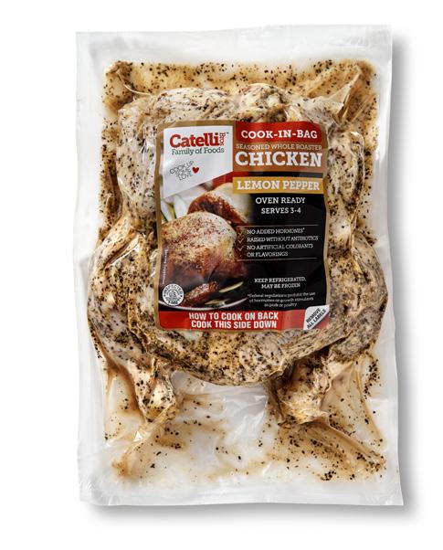 LEMON PEPPER OVEN READY SERVES 3-4 COOK-IN-BAG NO ADDED HORMONES RAISED WITHOUT ANTIBIOTICS NO ARTIFICIAL COLORANTS OR FLAVORINGS KEEP REFRIGERATED, MAY BE FROZEN *Federal regulations prohib the use of hormones or growth stimulants in pork or poultry. HOW TO COOK ON BACK COOK THIS SIDE DOWN REMOVE ALLLABELS 4.25” x 8” BACK LABEL % Daily Value* Total Fat 16g 21% Saturated Fat 0g 0% Trans Fat 0g Cholesterol 90mg 30% Sodium 580mg 25% Total Carbohydrate 2g 1% Dietary Fiber 0g 0% Total Sugars 0g Includes 0g Added Sugars 0% Protein 18g Vitamin D 0mcg 0% Calcium 9mg 0% Iron 2mg 10% Potassium 25mg 0% *The % Daily Value (DV) tells you how much nutrient in a serving of food contributes to a daily diet. 2,000 calories a day is used for general nutrition advice. Varied servings per container Serving size 4 oz (113g) Amount per serving Calories 240 Nutrition Facts Packed By: Catelli Brothers Family of Foods, 71 Blackstone Street Sutton MA 01590 USE OR FREEZE BY: POULTRY.SOMEFOOD PRODUCTSMAY CONTAIN BACTERIA THA COULD CAUSE ILLNESSI TH PRODUCT S MISHANDLEDORCOOKED IMPROPERLY. FORYOURPROTECTION,FOLLOWTHESE SAFEHANDLINGINSTRUCTIONS. SAFE HANDLING INSTRUCTIONS KEEP RAW MEAT AND/OR POULTRY PRODUCTAWAYFROMOTHERFOODS. WASH WORKINGSURFACES (INCLUDING CUTTINGBOARDS) UTENSILS ANDHANDS AFTER TOUCHI G MEAT OR POULTRY. KEEP FROZEN. THAW IN REFRIGERATORORMICROWAVE. REFRIGERATE LEFTOVERS IMMEDIATELY OR DISCARD. Lemon Pepper Seasoned Whole Roaster Chicken Ingredients: Whole Roaster Chicken, Lemon Pepper Rub (Spice, Salt, Corn Starch, Cane Sugar, Citric Acid, Lemon Peel, Dehydrated Onion, Dehydrated Garlic, Natural Extractives of Lemon, Oleoresin Turmeric). REMOVE ALL LABELS & COOK IN BAG THIS SIDE UP, 425°F 75 MINS. Do Not Microwave in Package. Cook to 165°F. BPA Free Packaging COOKING INSTRUCTIONS 1. Preheat oven to 425 F. 2. Place package on roasting pan on center oven rack. 3. Cook for 75 minutes or until internal temperature of 165 F. 4. Remove from oven, cut open bag, and place chicken and sauce on serving dish. 5. If you’ve frozen chicken, defrost in refrigerator before cooking. PLACE WEIGHT LABEL HERE NON AQUEOUS AREA 3” 700-1496 CFOF LEMON CHICKEN 4.25” x 5” 4.25” x 5” BACK