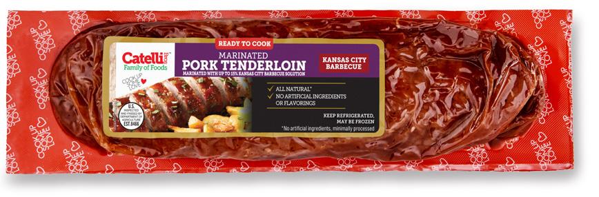 Serving Suggestion *No artificial ingredients minimally processed KEEP REFRIGERATED, MAY BE FROZEN ALL NATURAL NO ARTIFICIAL INGREDIENTS OR FLAVORINGS Packed By: Catelli Brothers Family of Foods, 71 Blackstone Street Sutton MA 01590 Kansas City Barbecue Marinated Pork Tenderloin % Daily Value* Total Fat 3.5g 4% Saturated Fat 1g 5% Cholesterol 65mg 22% Sodium 160mg 7% Total Carbohydrate 5g 2% Dietary Fiber 0g 0% Total Sugars 4g Includes 3g Added Sugars 6% Protein 20g Potassium 432mg 10% Iron 1mg 6% Varied servings per container Serving size 4 oz (112g) Amount per serving Calories 140 Nutrition Facts Not significant amount of Trans Fat, Vitamin D, Calcium. REMOVE PORK TENDERLOIN FROM PACKAGE THIS PRODUCT WAS PREPARED FROM INSPECTED AND PASSED MEAT AND/OR POULTRY SOME FOOD PRODUCTS MAY CONTAIN BACTERIA THA COULD CAUSE ILLNESSI THE PRODUCTIS MISHANDLEDORCOOKEDIMPROPERLY.FORYOURPROTECTION,FOLLOWTHESESAFE HANDLING INSTRUCTIONS. SAFE HANDLING INSTRUCTIONS KEEP RAW MEA AND/OR POULTRY PRODUCT AWAYFROM OTHER FOODS. WASH WORKING SURFACES (INCLUDINGCUTTINGBOARDS), UTENSILSAND HANDSAFTER TOUCHING MEAT OR POULTRY. KEEP FROZEN. THAW IN REFRIGERATOR OR MICROWAVE. COOK THOROUGHLY. KEEP HOT FOODS HOT. REFRIGERATE LEFTOVERS IMMEDIATELY OR DISCARD. Do Not Microwave in Package. Cook to 145°F. USE OR FREEZE BY: Ingredients: Pork Tenderloin, Kansas City Barbecue Solution (Filtered Water, Tomato Paste, Vinegar, Cane Sugar, Molasses, Brown Sugar, Salt, Corn Starch, Dehydrated Onion, Chili Powder, Worcestershire Sauce (Distilled White Vinegar, Molasses, Sugar, Water, Salt, Onions, Anchovies, Garlic, Cloves, Tamarind Extract, Natural Flavors, Chili Pepper Extract), Soy Sauce (Water, Soybeans, Wheat, Salt), Dehydrated Garlic, Paprika, Spices, Cultured Dextrose, Phosphoric Acid, Mustard, Natural Smoke Flavor). Contains Fish (Anchovies), Soy, Wheat. COOKING INSTRUCTIONS OVEN 1. Preheat oven to 425 F. Reserve some marinade from package. 2. Before roasting sear in hot skillet or sauté pan on all sides. 3. Place in shallow roasting pan on center oven rack, brush marinade on meat. 4. Roast for 20-30 minutes or until internal temperature of 145 F. 5. Rest 3 minutes before slicing. GRILL 1. Preheat grill on medium. 2. Add pork to center of grill, grill for 12-15 minutes. 3. Flip tenderloin to other side, cook 12-15 minutes more, or unti internal temperature of 145 F. 4. Rest 3 minutes before slicing. KANSAS CITY BARBECUE MARINATED WITH UP TO 15% KANSAS CITY BARBECUE SOLUTION READY TO COOK 5.375” x 2.75” 6” x 2”