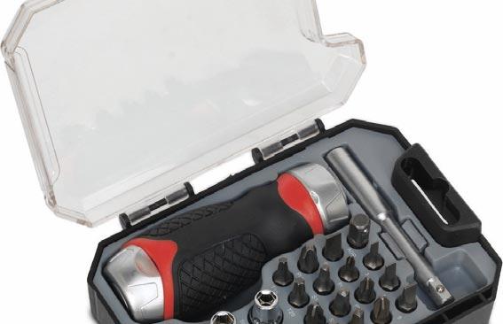 The metal encased reversible ratchet handle has a twist-action section at the top that changes the direction, and it’s really comfortable in the hand because of the textured soft grip.