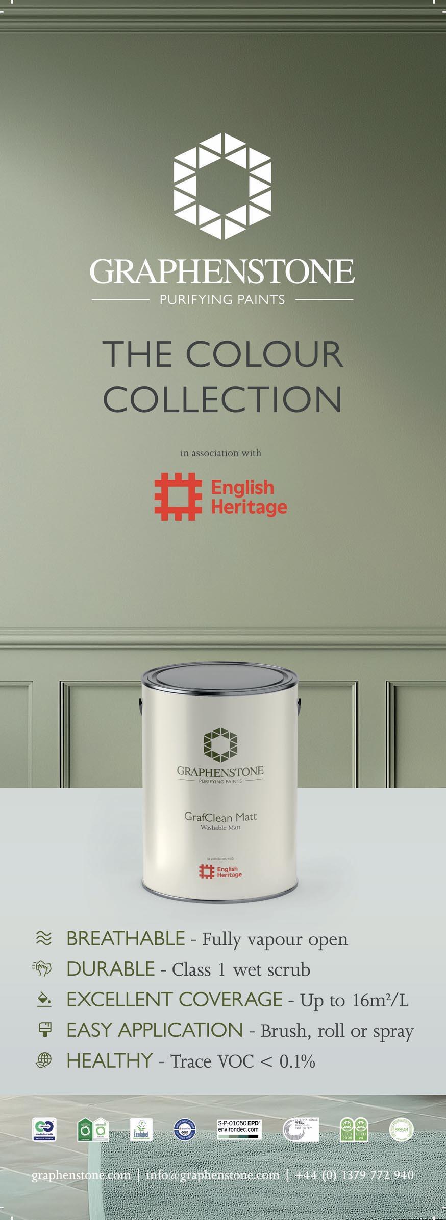 The Colour Collection is a new selection of 120 colours, incorporating 24 English Heritage shades and replacing Graphenstone’s current House Colour Card, which archives 64 colours from their existing range. All archived colours will still be available to order.