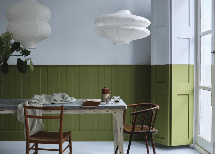 Lower panelling: Sap Green No.199 – Upper walls and woodwork: Sizing No.314