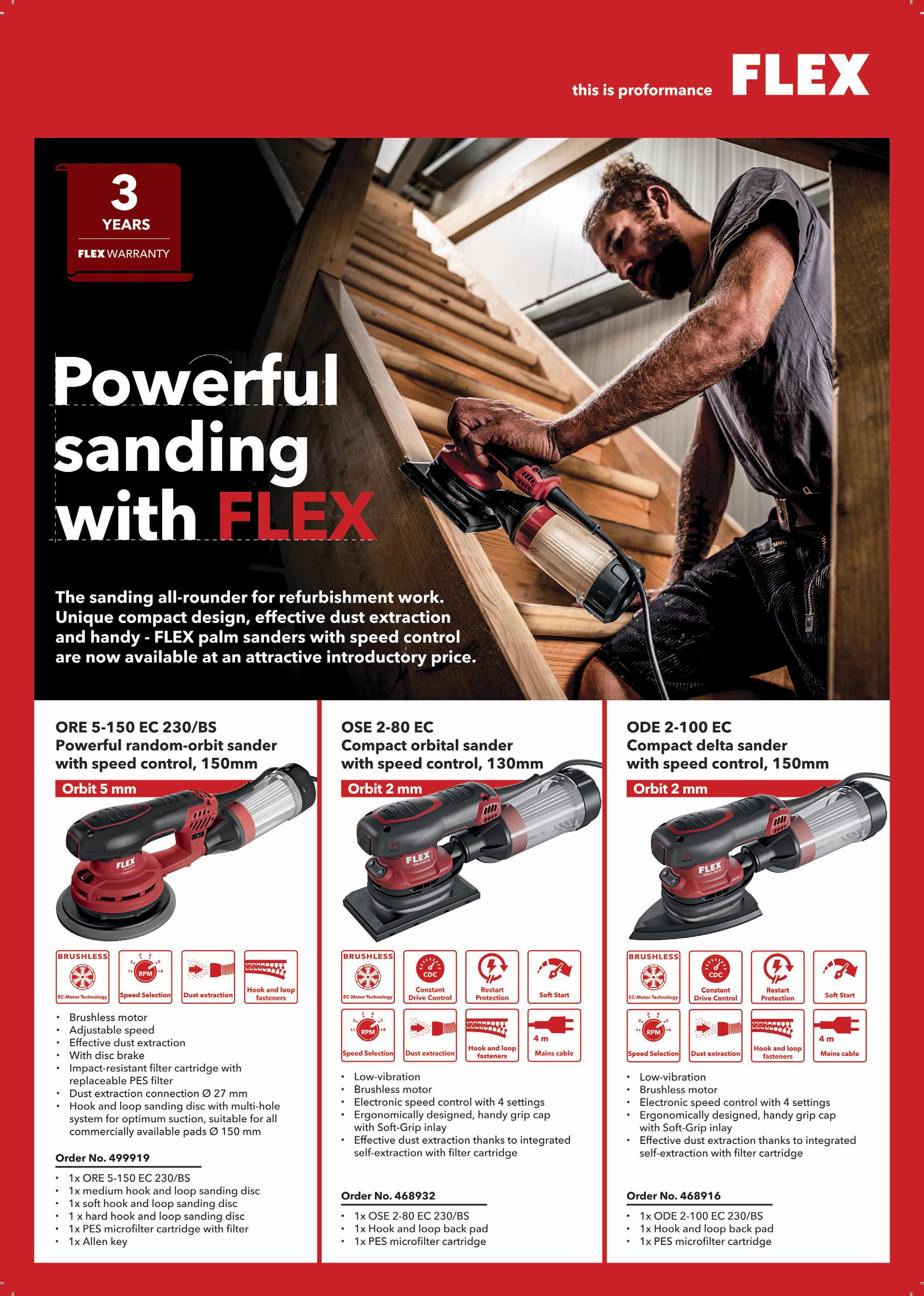Leading the charge is the GE 6 R carbon composite wall and ceiling sander, the lightest Giraffe of all time from FLEX. Making easy work of even the toughest sanding tasks, the unique, lightweight GE 6 R has been developed by professionals to guarantee perfect results. In addition, a range of three corded FLEX sanders will be offered at the selected Crown Decorating Centres (ORE 5-150, OSE 2-80 and ODE 100). For flawless surfaces on every project, the random orbit, delta and orbital sander are powerful, innovative and durable machines, featuring brushless motors with variable speeds and vibration-free running.