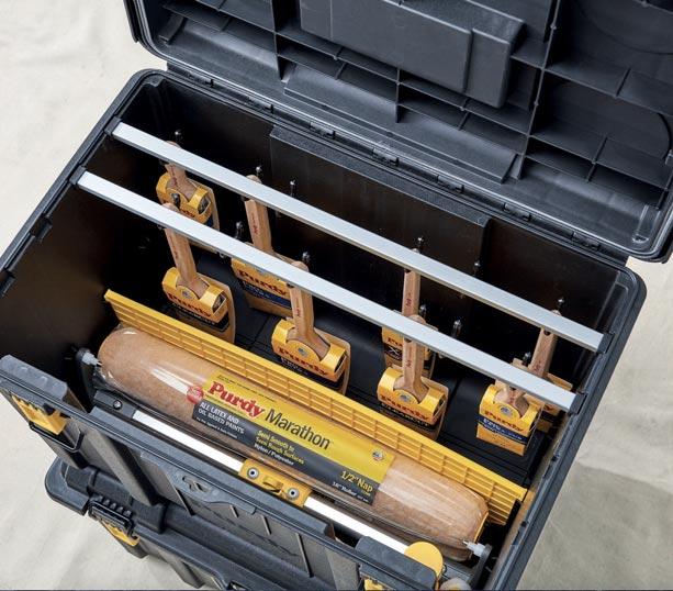 The storage system also includes a uniquely designed Wet Brush and Roller Cover Bin, for storing wet brushes and rollers up to 18 inches in length, without getting paint on anything else in the box, keeping it neat and tidy. There are also two Extension Pole Holders built-in to the box system, alongside a telescopic pull handle.