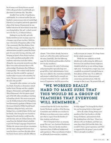 lot of names were being thrown around. I felt really good when I could finally give directions to someone else,” she jokes. Another Cate newbie, Craig Bouma, understands. As a veteran teacher (he just finished a nineteen-year stint at Loyola High School in Los Angeles) and newly appointed chair of the Science Department, he was baffled whenever he heard about events that were being held in “the jail” – which turned out to be the J.L, or Johnson Library. Finding its way this fall, and with family members in tow in many cases—is a bumper crop of new teachers. With the June retirement of long-time pillars of the Cate community like Ross Robins, Peter and Mary Arango, and Bob Bonning, the
