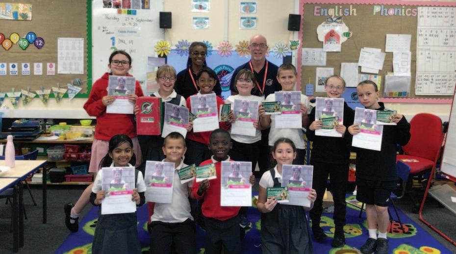 Debra and Mark with students at St Mary and St Peter Primary School in Gorleston.