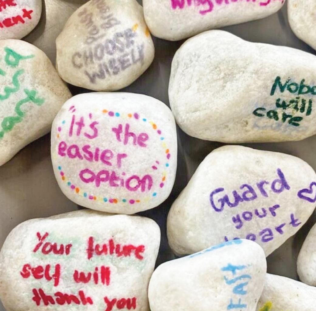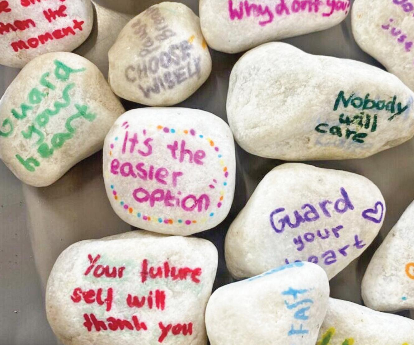 The Sixth Form reflected on Jesus’ temptation in the desert by exploring how temptations can appear attractive. Students decorated stones with words and phrases that help them resist these pressures and choose integrity, compassion, and faith. A powerful reminder to choose the better path. Year 8 explored the difference between what we show on