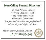 JILL GLENCROSS FUNERAL DIRECTORS An Independent Multi Award Winning Family Funeral Directors Female and Male Funeral Directors Private Chapels of Rest Nothing Is Ever Too Much Trouble 16 The Square, Dalston, Carlisle CA5 7PY Tel: 01228 317373 https://www.jillglencrossfuneraldirector.co.uk/ To advertise please contact Charlotte on 01440 730399 or email charlotter@ cathcom.org Michael G Maddison Independent Funeral Director 57 – 61 Newtown Road, Carlisle, Cumbria CA2 7JB Tel : 01228 317577 I offer a 24 hour 365 day a year Caring, Professional Service and have over 20 years experience Private Chapels of Rest and Memorials Pre Paid Funeral Plans Able to support you when needed Michael George Maddison holder of an Advanced Diploma in Funeral Directing email: mgm.funerals@outlook.com website: www. mgmfunerals.co.uk fb: Michael G Maddison Independent Funeral Director