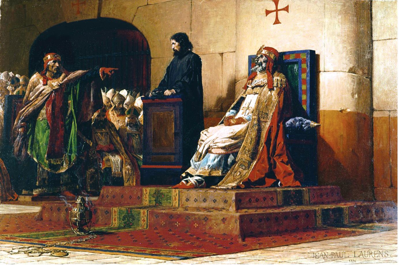 But the events of Formosus’ life are completely overshadowed by the events after his death. His successor, Boniface VI, had died of gout after only 15 days, although some scholars speculate he had been ousted by vengeful Spoletans. He was replaced by Stephen VI. It is uncertain who instigated the affair that followed, but it’s easy to think the Spoletans were still rather angry at having lost the imperial crown due to the actions of the late Pope Formosus. As a result, the tale goes that Stephen VI ordered an impromptu synod of the Roman clergy. In January 897, the priests, bishops and cardinals entered the papal court to a macabre display. There, seated on a throne, sat the lifeless corpse of the late Pope Formosus, dressed in papal vestments. A presumably rather disturbed and nervous deacon stood next to the corpse and answered Pope Stephen’s angry questions on behalf of the corpse.