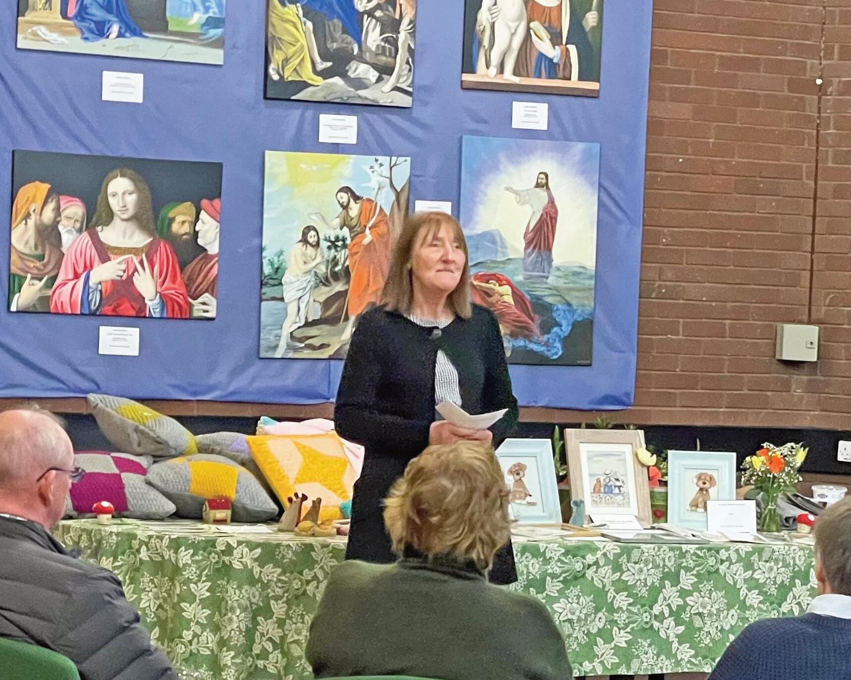 Breathtakingly beautiful paintings in oils and acrylic on canvas by Carol Morris were hung across two walls, most of which depicted the life of Christ by recreating the work of great artists including Carravagio, Leonardo da Vinci, Rembrandt and others. She also included a life size painting of Our Lady of Guadaloupe.