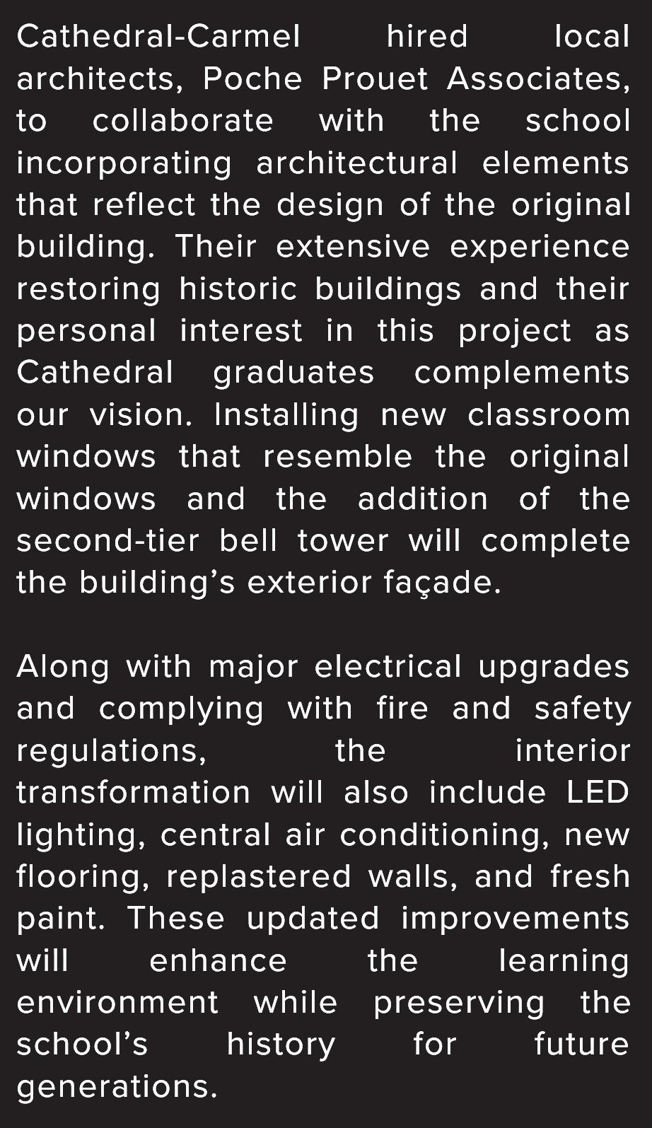 The goa o a Ca ho c educa on s he forma on o he who e pe son – un ng he nte ec ua and he sp tua he m nd and he hear The es o at on o th s M dd e Schoo Bu d ng and he utu e renova ons o he 2nd - 4th grade bu d ng w p eserve he uture o Ca hed a -Carme Schoo On beha o our cur ent s uden s and hose who w one day wa k he ha s o CCS we ask that you p ayer u y cons de o n ng us n ou restora on e o ts Thank you o you suppor as we cont nue o p ov de a s rong Ca ho c educa on form ng Ch st-cen e ed s uden s