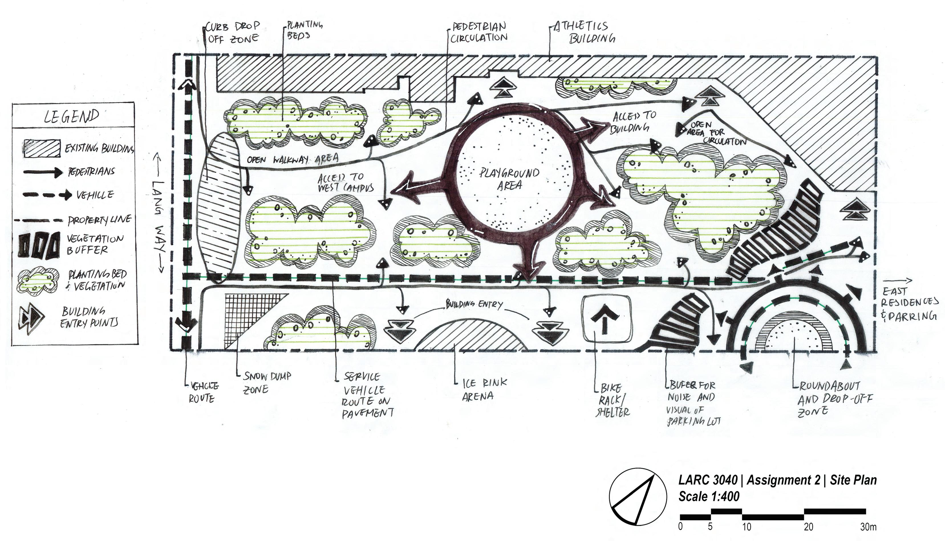 The projec t site was set in front of the University of Guelph’s Atheltic Centre, and the objective of this project was to create a series of analysis diagrams and a final functional diagram that will ultimately assist in creating an alternative conceptual design. The new plaza will encourage the usage of the public space in front of the surrounding to enrich the landscape and provide a rest area for the public. With the proposed plaza, the intention is to create a welcoming and well-circulated space with seating areas for visitors of all ages.