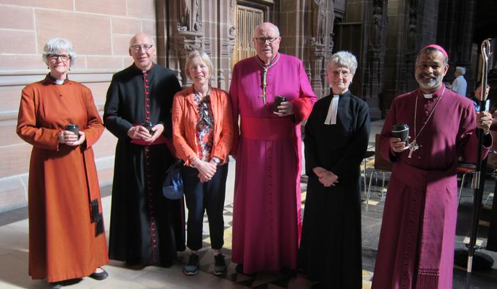The Very Revd Dr Sue Jones, Liverpool Cathedral Dean; Rev Tony O’Brien, Metropolitan Cathedral Dean; Elisabeth Hachmoeller Ecumenical Co-ordinator for CTMR; Archbishop Malcolm McMahon; Dr Sheryl Anderson; Bishop John Perumbalath