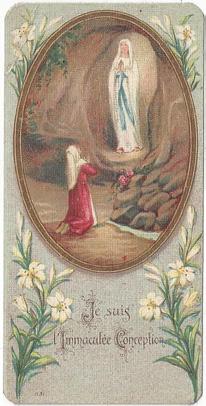 A French bookmark illustrating one of the apparitions to St Bernadette,