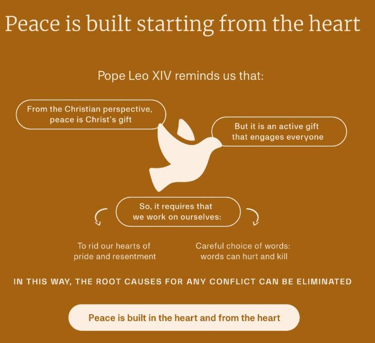 This, he said, entails, “the necessity of working on oneself first of all; to rid one’s heart of pride, and the expectations and negative words that hurt and kill. As Pope Leo XIV teaches us, peace is built in the heart and from the heart.”