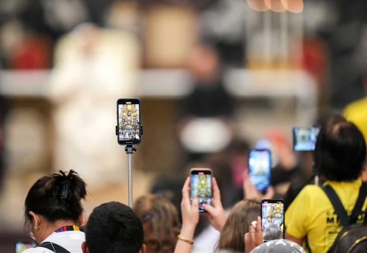 People use their cellphones to record Pope Leo XIV as he addresses them during the Jubilee of Digital Missionaries and Catholic Influencers in St. Peter’s Basilica at the Vatican July 29, 2025. (CNS photo/Lola Gomez)