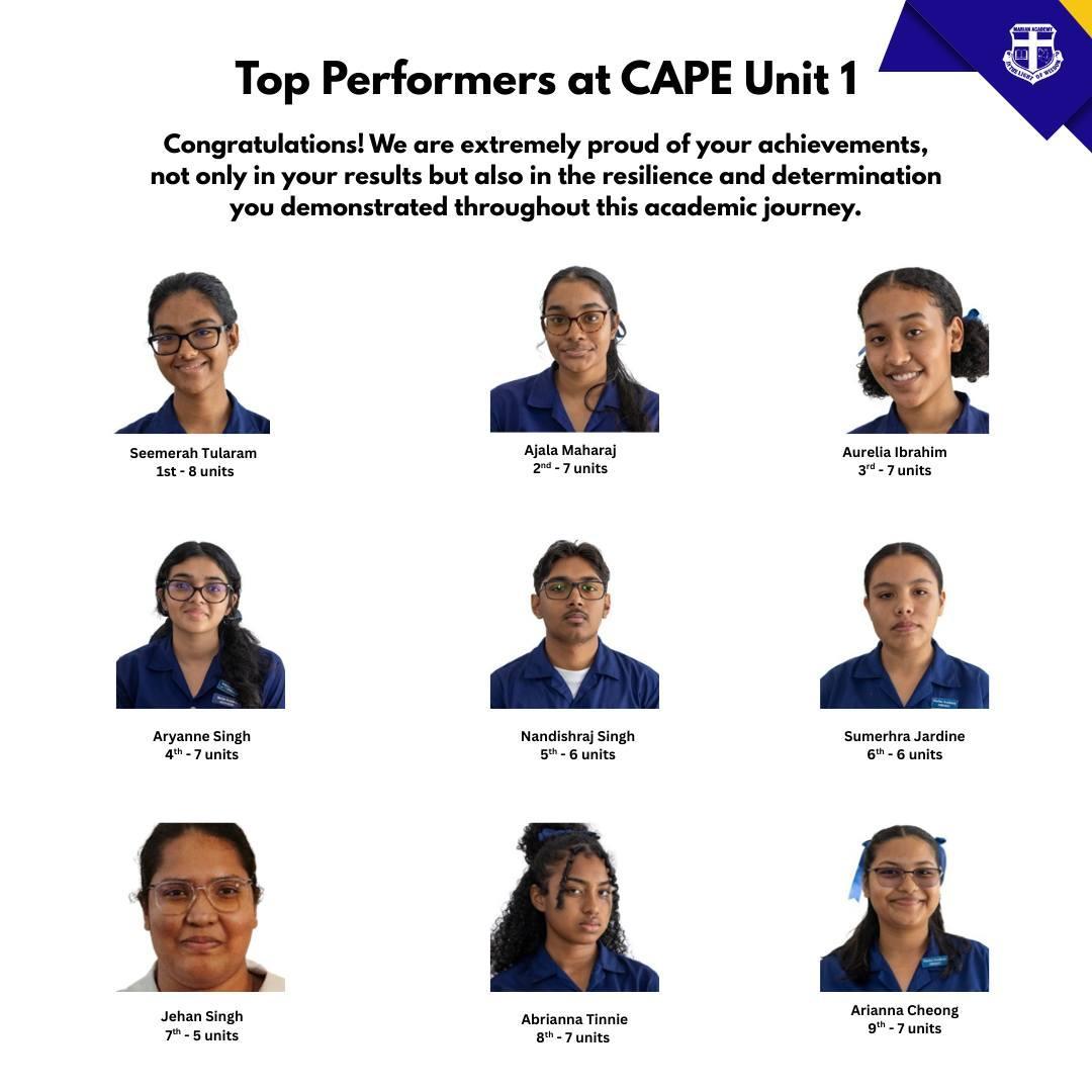Leading the 2024-2025 cohort of CSEC top performers at Marian are: Amya Insanally (13 subjects, 11 Grade 1s, 2 Grade 2s); Angelina Khan (14 subjects, 11 Grade1s, 1 Grade 2, 2 Grade 3s); and Brandon Ramjit (12 subjects, 8 Grade 1s, 3 Grade 2s, 1 Grade 3).
