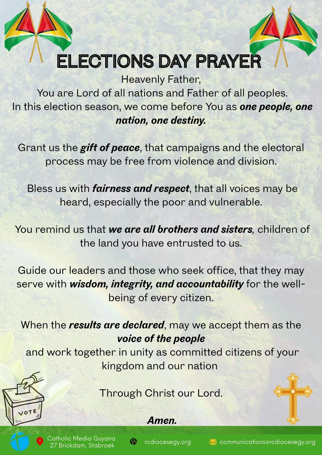 As Guyanese prepare to vote, the Roman Catholic Church of Guyana commits to continued prayer for peaceful elections and the wisdom of all citizens in exercising their democratic rights. Beyond September 1, the Church pledges to support ongoing dialogue initiatives, civic education programs, and reconciliation efforts essential fordemocratic consolidation.