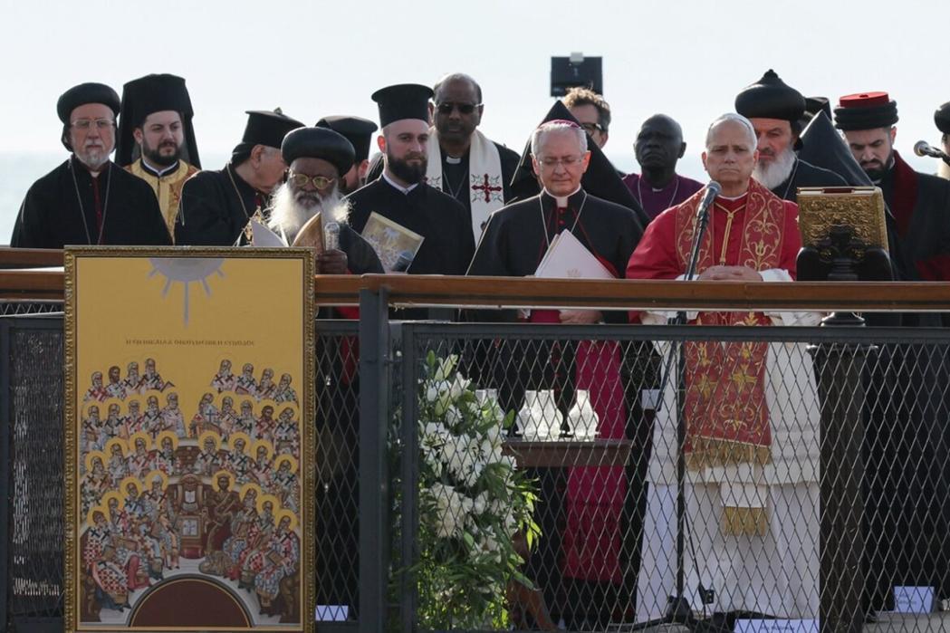 Standing on a platform overlooking the remains of the Basilica of St. Neophytos, now partially submerged in Lake Iznik, the church leaders took turns leading the prayers in English, Greek and Arabic and lighting candles as a Catholic choir, singing in Latin, and an Orthodox choir, singing in Greek, alternated.