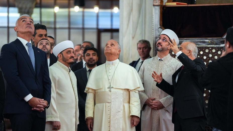 Pope Leo XIV looks up at the ceiling of the Sultan Ahmed Mosque, more commonly called the Blue Mosque, in Istanbul, Turkey, during a visit Nov. 29, 2025. Kurra Hafiz Fatih Kaya, the imam of the mosque, is to the right of the pope; Emrullah Tuncel, the mufti of Istanbul, is to the left of the pope; and Askin Musa Tunca, the mosque's muezzin, wearing a suit and tie, is guiding the visit. (CNS photo/Lola Gomez)