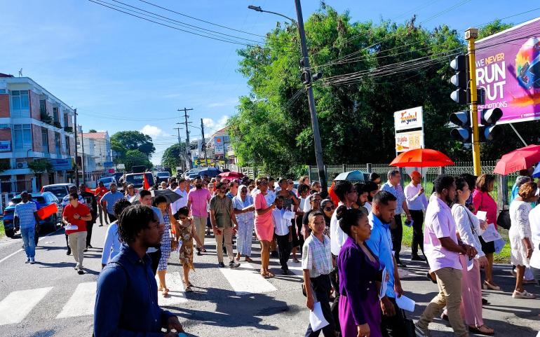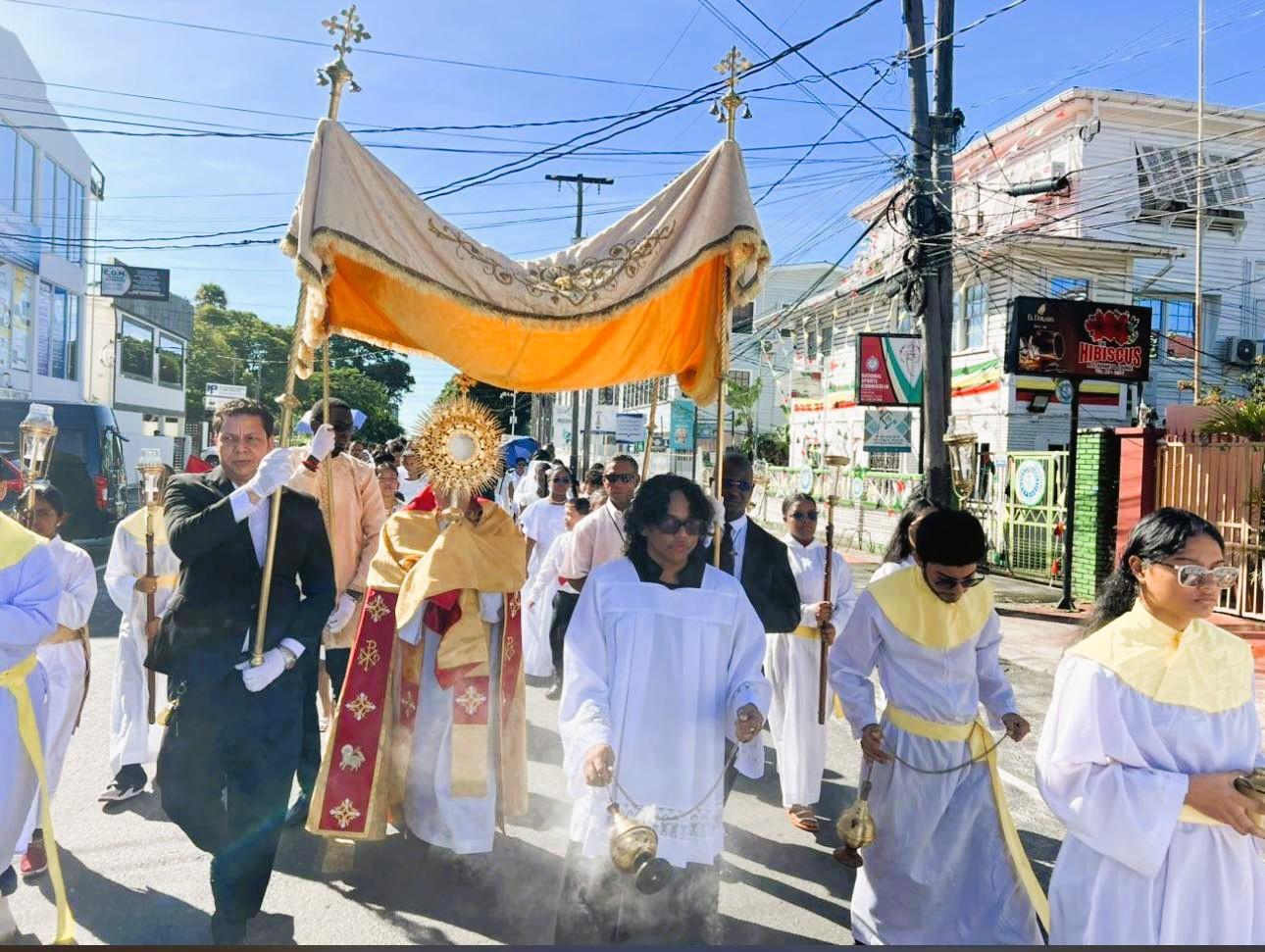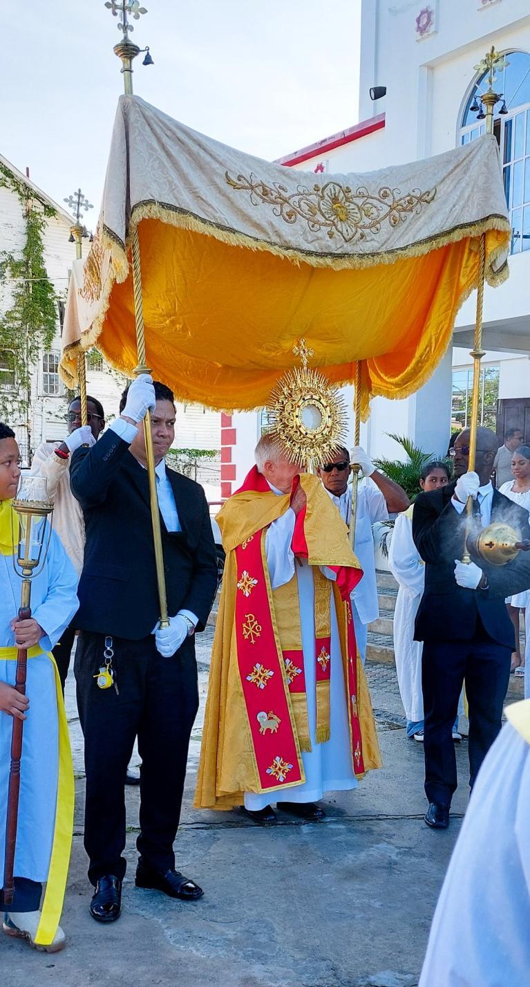 Bishop Francis Alleyne OSB carries a monstrance with the Blessed Sacrament in the Central Cluster’s Corpus Christi procession, June 22. (Photo: Joshua Van-Sluytman)
