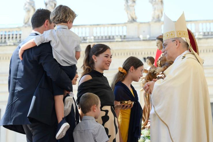 A family presents the offertory gifts to Pope Leo XIV during Mass marking the Jubilee of Families, Children, Grandparents and the Elderly in St. Peter’s Square at the Vatican June 1, 2025. (CNS photo/Vatican Media)