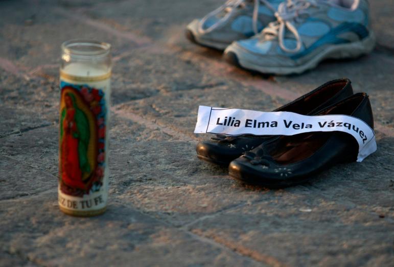 A file photo in Monterrey, Mexico, shows a candle with an image of Our Lady of Guadalupe and pairs of shoes with a name tag of its owner, a victim of the drug war. In a statement shared March 12, 2025 the Mexican bishops' conference expressed outrage over the discovery of an extermination camp operated by a drug cartel, calling it "one of the cruelest expressions of evil and human misery that we've seen in the country," and alleging such sites exist in other parts of Mexico. (OSV News photo/Daniel Becerril, Reuters)