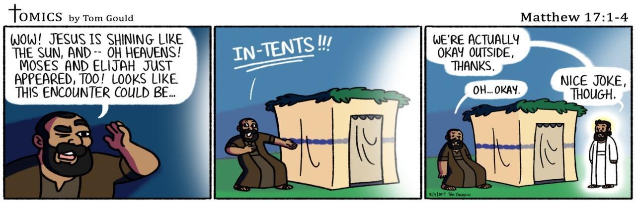 Peter and the others had fallen asleep and when they woke up, they saw Jesus and the other two talking. They were amazed at that wonderful sight! As Moses and Elijah were starting to leave, Peter said to Jesus. "Master, it is wonderful for us to be here! Let's build three shelters one for you, one for Moses, and one for Elijah."