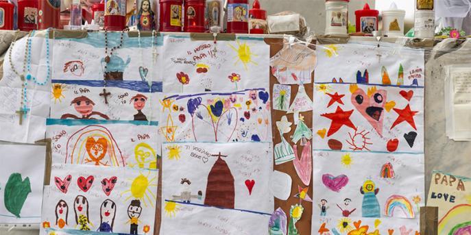 Drawings for Pope Francis cover the base of a statue of St. John Paul II outside Rome's Gemelli hospital March 8, 2025. (CNS photo by Pablo Esparza)