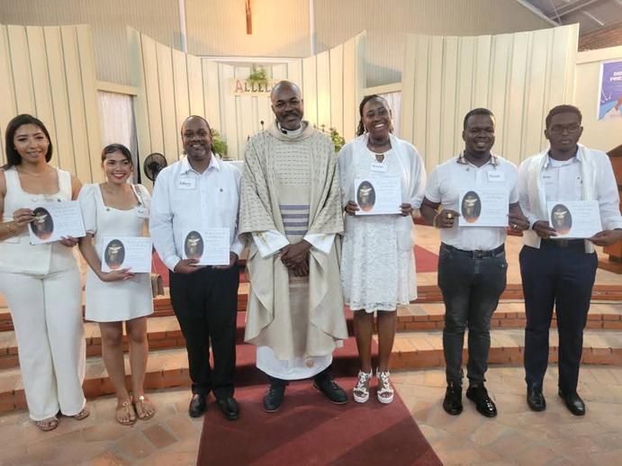 Parishioners of the North Georgetown Cluster (St. Teresa and Holy Rosary, Kitty) congratulate the six members of their RCIA process who were baptized and/or confirmed during the Easter Vigil Mass at Holy Rosary church, Kitty, on Saturday, April 19th. Rhonda Vieira and Moses Blackman received the sacraments of Adult Initiation, and Nikel Narine,